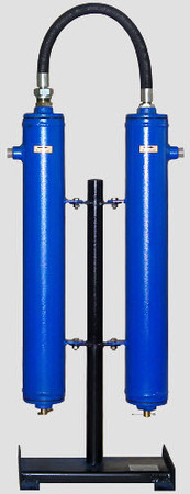 Фильтрационный модуль (ФМ) предназначен для тонкой очистки сжатого воздуха и различных газов от аэрозолей масла и влаги, а также от твердых частиц размером менее 1 мкм. Обеспечиваемое остаточное содержание аэрозоля масла - менее 0,1 мг/м3. Используется в системах пневмоуправления и автоматики, пневмоприводе устройств и инструмента для окраски поверхностей распылением. ФМ состоит их двух последовательно установленных фильтров с фильтроэлементами на основе ультратонкого стекловолокна без связующего. Первый по ходу газа фильтр предназначен для отделения механических примесей и крупных капель масла и влаги, а также для укрупнения оставшегося в потоке тонкодисперсного аэрозоля. Второй по ходу газа фильтр служит для окончательной очистки газа от примесей. Сжатый воздух поступает в фильтр через боковой патрубок модуля грубой очистки, проходит фильтрующие стекловолокнистые слои фильтроэлементов грубой и тонкой очистки и выходит из фильтра через боковой патрубок модуля тонкой очистки. Оба фильтра работают в режиме самоочищения от жидких примесей. Отделившаяся жидкость собирается в нижней части корпуса и периодически выводится через сливные штуцера, при открытии установленных на них запорных вентилей.