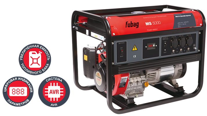 Экономичная электростанция, с мощным и надёжным бензиновым двигателем Mitsubishi, номинальной мощностью 4,2 кВт., рассчитана на работу с высокими нагрузками без дозаправки в течение длительного времени. Имеет достаточную мощность, чтобы с успехом использоваться в качестве аварийного источника энергоснабжения загородного дома или для питания большинства типов электроинструмента на стройплощадке.