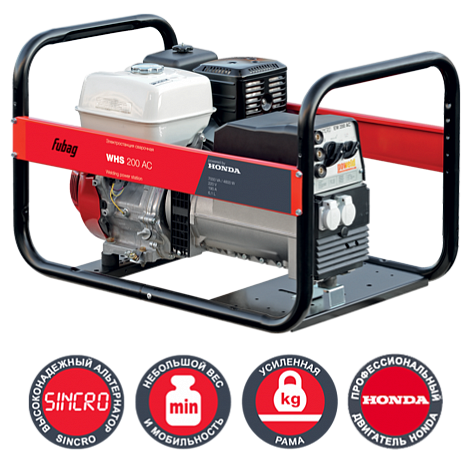 Удобная для транспортировки сварочная электростанция переменного тока оснащена надёжным и экономичным профессиональным бензиновым двигателем Honda GX OHV. Топливный бак объёмом 6,1 литра позволяет станции работать без остановки в течение 2,4 часа. Отличный выбор для использования во время строительных и монтажных работ, где нет повышенных требования к качеству сварного соединения. Усиленная рама делает оборудование пригодным к использованию в жестких условиях стройки.