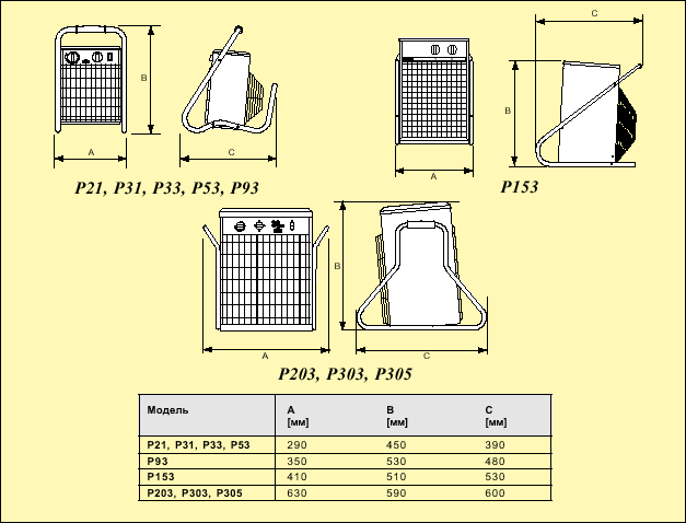 - Поставляются с кабелем длиной 1,8 м. P21 и P31 поставляются с вилкой для подсоединения к заземленной стенной розетке (для P31 необходим предохранитель 16 A ). P33, P53 и P93 имеют 5-и полюсную вилку европейского образца. P153, P203, P303 и P305 поставляются без вилки.